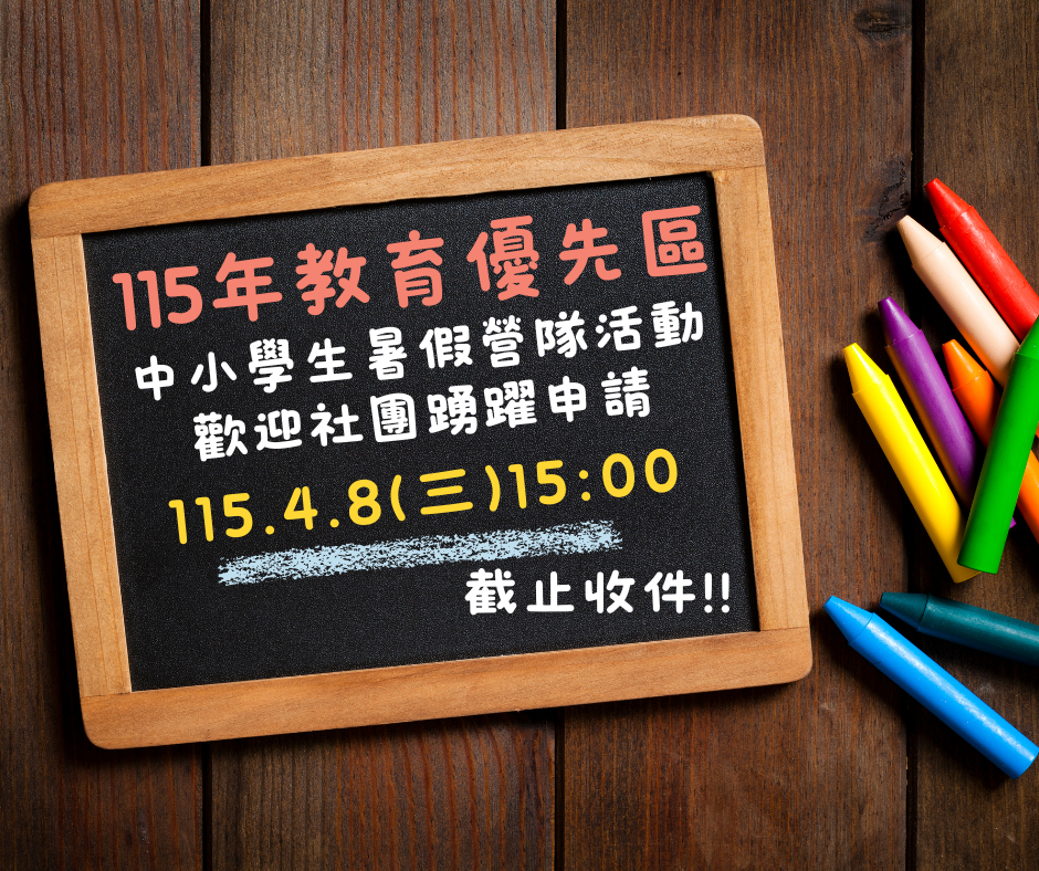 【教育優先區】教育部115年教育優先區中小學生暑假營隊活動,即日起受理申請至115.4.8(三)下午15:00截止收件。