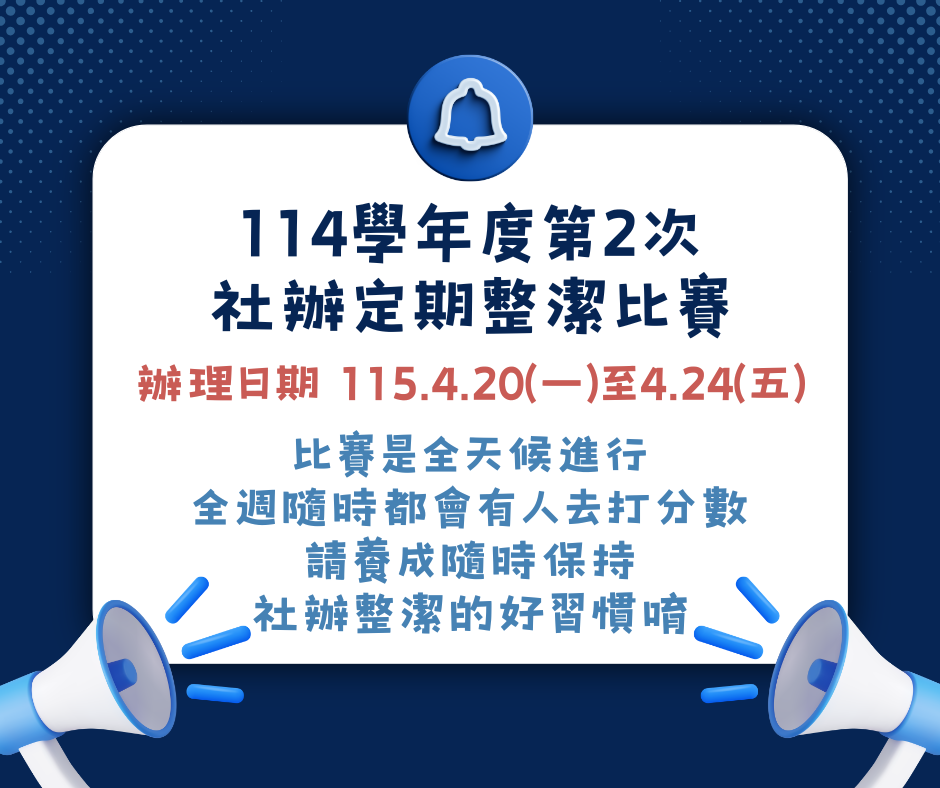 【重要】114學年度第2次社辦定期整潔比賽(115年4月20日至4月24日辦理)